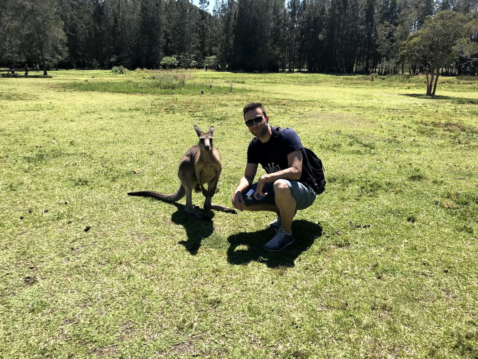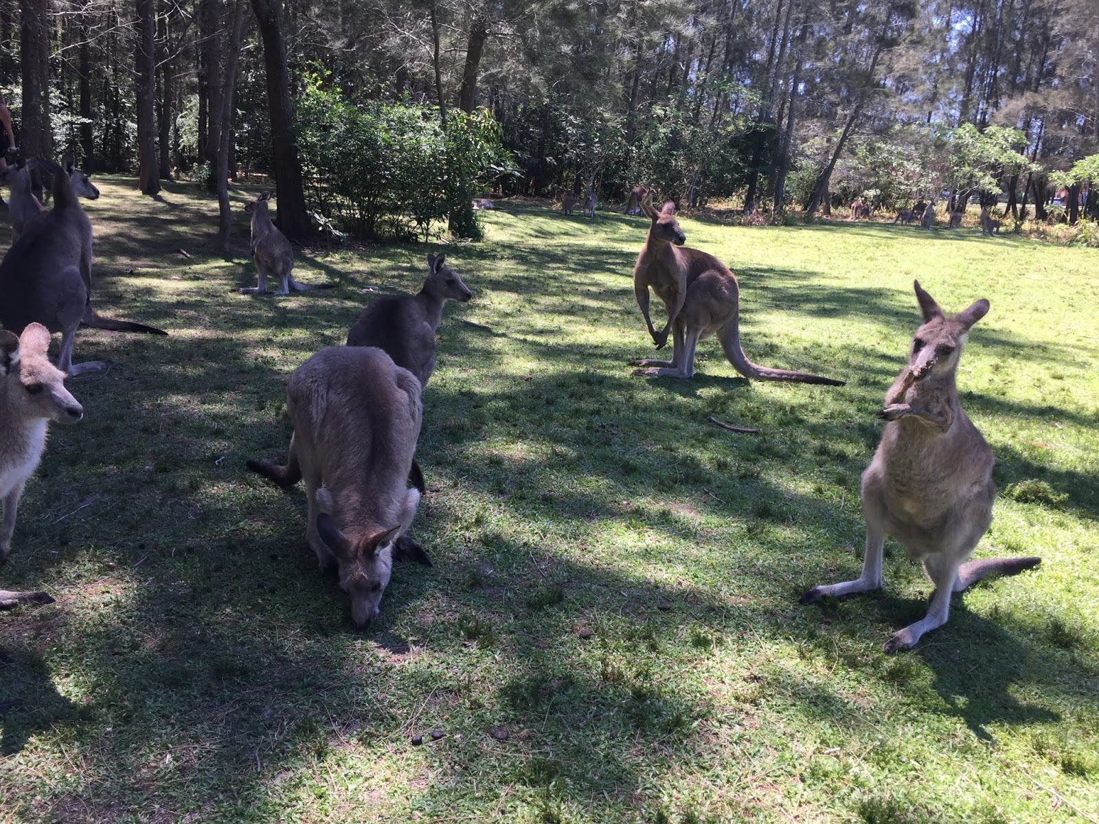 Uma grande reserva florestal abriga centenas e talvez milhares de cangurus que estão super acostumado com a visita de nós (humanos).