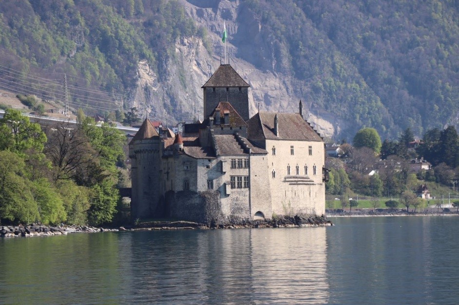Andamos até o Château de Chillon, é um castelo que fica sobre uma rocha no meio do Lago Genebra, muito bonito!